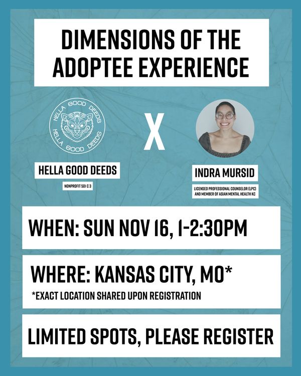 Join a small, supportive space for adoptees to reflect, share, and connect. Led by Indra Mursid, LPC, a Khmer/Cambodian transracial adoptee, this session invites you to explore your adoption journey, discover language that resonates with your experience, and engage in open conversation with fellow adoptees.