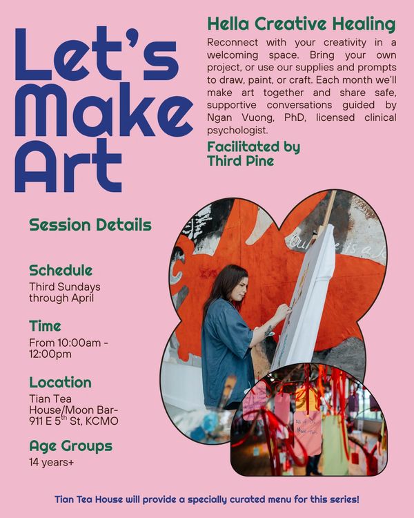 We're bringing Third Pine to Tian Tea House/Moon Bar for our Hella Creative Healing series! Join us for two hours of dedicated space to (re)connect with your creativity. Bring your own project or use drawing, painting, and crafting supplies and prompts provided. Registration required-only 20 seats per session available!